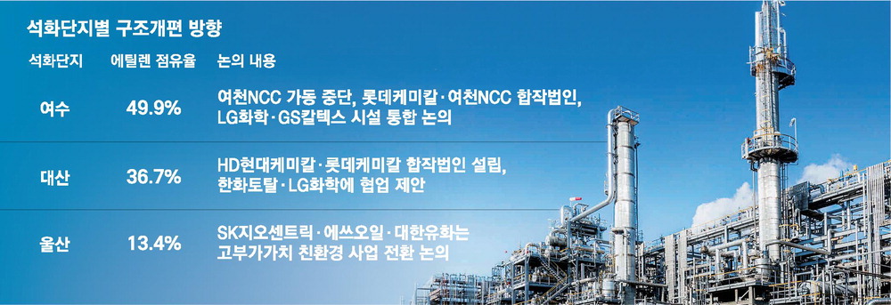현재까지 주요 석화 기업들이 내놓은 구조개편안 중 1호는 대산석유화학단지에서 HD현대케미칼과 롯데케미칼의 대산 1공장 감산·조정안이다. 대산 지역은 대형 설비 간 통합과 기능 조정 가능성이 비교적 구체화된 권역으로 평가받고 있다.