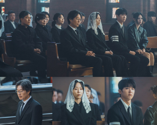 공개된 스틸컷 속 성당 장례미사에 나란히 앉아 있는 준경, 진호, 준서 가족. 슬픔에 잠긴 세 사람의 모습은 이미 이전의 시간으로 돌아갈 수 없음을 암시한다. 이 장면은 단순히 상실을 보여주기 위한 장면이 아니라, 왜 이들이 가족의 죽음을 맞닥뜨렸는지, 그리고 이후의 삶과 관계가 어떤 방향으로 흘러가게 될지를 묻는 출발점이다.