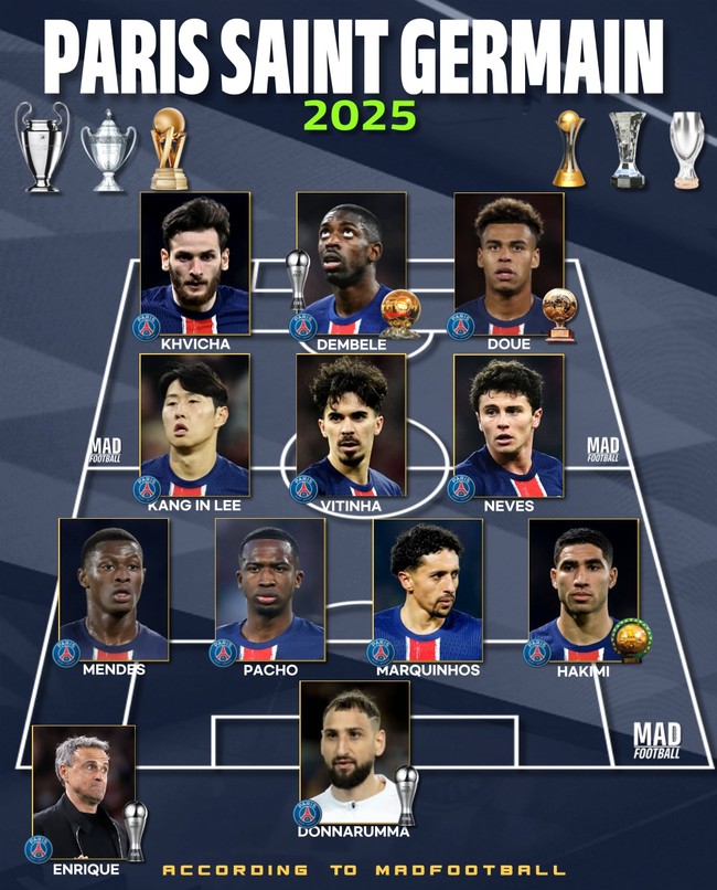 축구 컨텐츠 매체 '매드 풋볼'은 18일(이하 한국시간) 2025년 PSG 베스트11을 공개했다. 우스만 뎀벨레, 흐비차 크바라츠헬리아, 비티냐, 마르퀴뇨스 등 주축 선수들이 대거 이름을 올렸다. 여기에 이강인도 포함됐다.