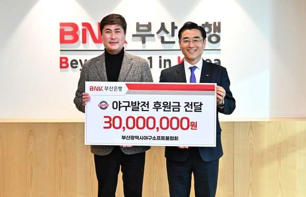 BNK부산은행 신식 개인고객그룹장(오른쪽)과 부산광역시야구소프트볼협회 정신 회장이 19일 부산은행 본점에서 진행된 전달식에서 기념촬영을 하고 있다. [사진=BNK부산은행]BNK부산은행이 이날 오후, 부산은행 본점에서 부산광역시야구소프트볼협회에 유소년 야구 발전을 위한 후원금 3000만원을 전달했다고 밝혔다고 19일 밝혔다.