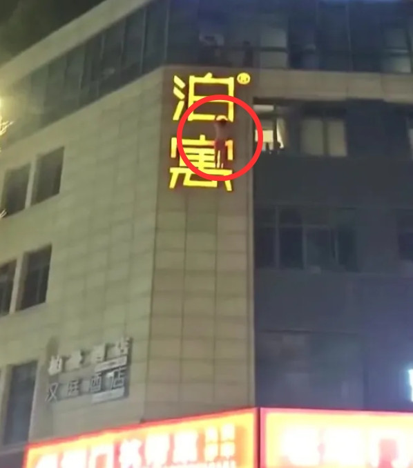 중국에서 속옷만 입은 채 호텔 간판에 매달린 남성이 포착됐습니다.