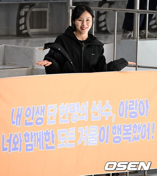 은퇴식을 하루 앞둔 쇼트트랙 김아랑이 팬들이 준비한 응원 현수막과 함께 포즈를 취하고 있다. 2025.12.19 /cej@osen.co.kr
