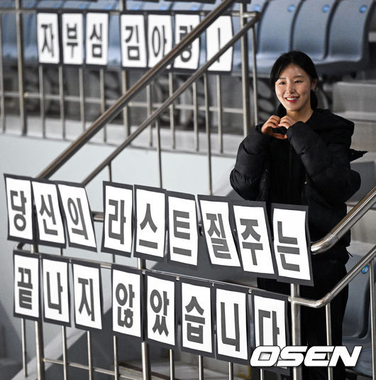은퇴식을 하루 앞둔 쇼트트랙 김아랑이 팬들이 준비한 응원 현수막과 함께 포즈를 취하고 있다. 2025.12.19 /cej@osen.co.kr
