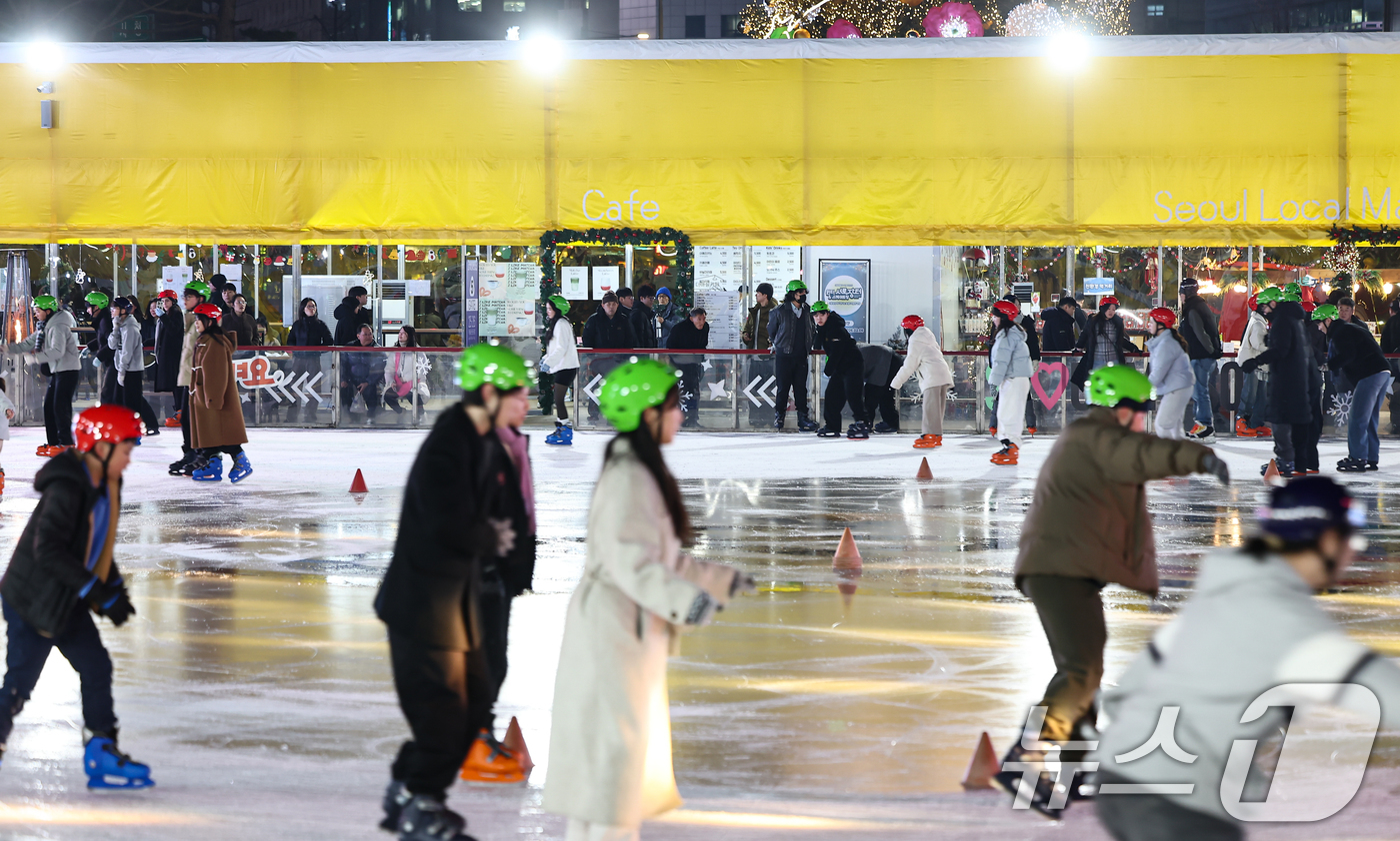 (서울=뉴스1) 김도우 기자 = 19일 오후 서울광장 스케이트장에서 시민들이 스케이트를 타며 즐거운 시간을 보내고 있다. 이날 개장한 서울광장 스케이트장은 내년 2월 8일까지 52일 동안 운영한다. 2025.12.19/뉴스1