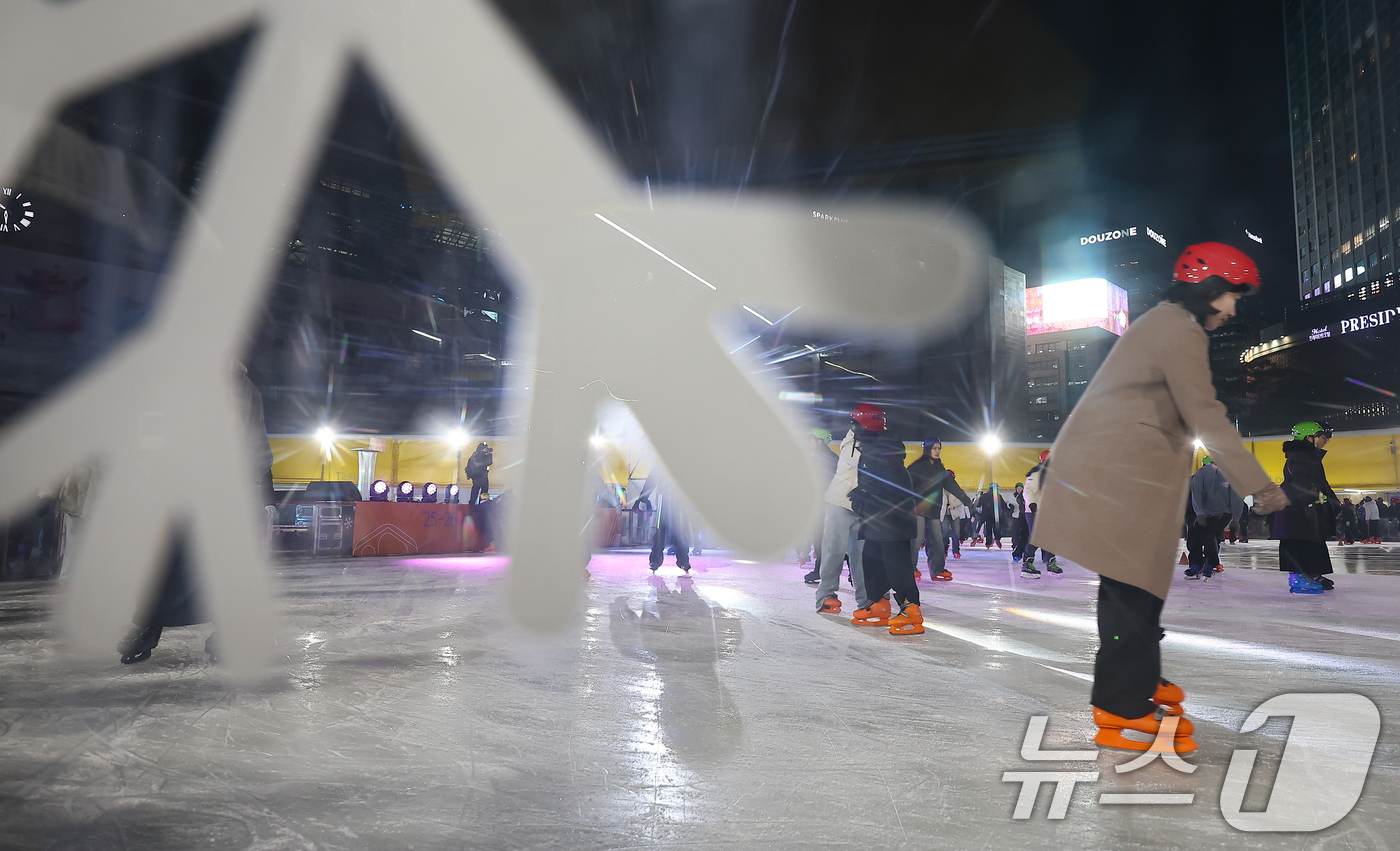 (서울=뉴스1) 김도우 기자 = 19일 오후 서울광장 스케이트장에서 시민들이 스케이트를 타며 즐거운 시간을 보내고 있다. 이날 개장한 서울광장 스케이트장은 내년 2월 8일까지 52일 동안 운영한다. 2025.12.19/뉴스1