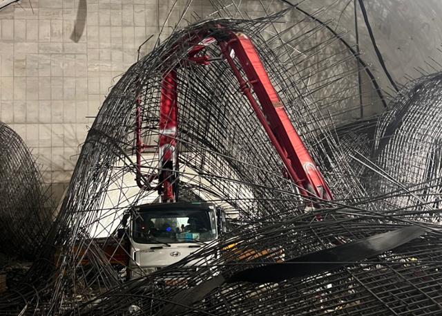 18일 서울 영등포구 여의도역 신안산선 공사현장 지하 70m 지점에서 철근이 무너져 있다. 이 사고로 매몰된 50대 남성이 사망했다. 뉴스1 |