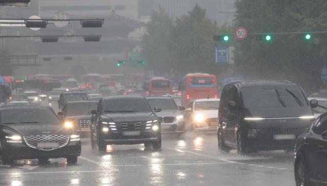 전국이 대체로 흐리고 비가 내리는 24일 서울광장 앞 도로에서 차량이 전조등을 켜고 주행하고 있다. [사진=연합뉴스] |