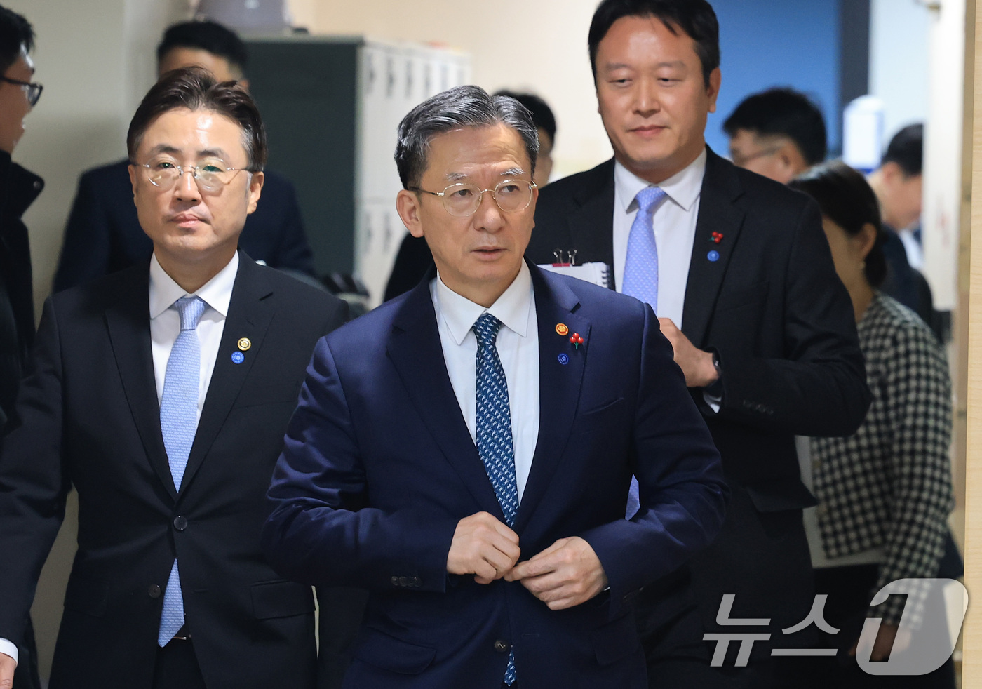 (서울=뉴스1) 임세영 기자 = 정성호 법무부 장관이 19일 서울 종로구 정부서울청사에서 업무보고 사후 브리핑을 하기 위해 이동하고 있다. 2025.12.19/뉴스1