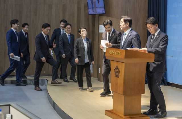 ▲대전·충남에 지역구를 둔 더불어민주당 의원들이 19일 국회 소통관에서 대전·충남 통합 관련 기자회견을 하기 위해 입장하고 있다. ⓒ연합뉴스 |