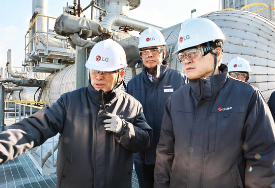 김정관 산업통상부 장관이 지난달 26일 오전 전남 여수시 여수산업단지에 소재한 LG화학 산업현장을 방문해 신학철 LG화학 부회장과 함께 현장 관계자의 이야기를 듣고 있다. 뉴스1 |