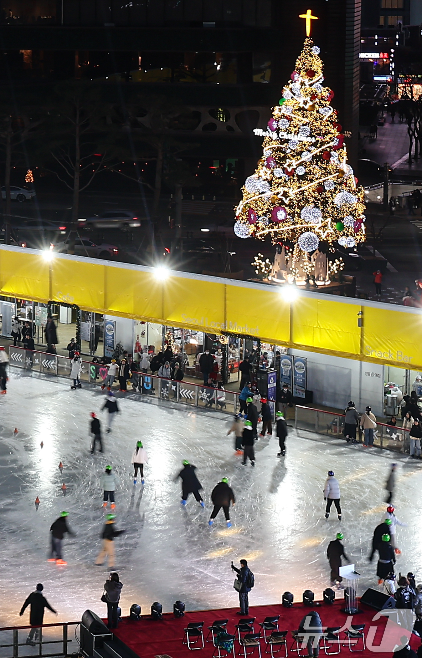 (서울=뉴스1) 김도우 기자 = 19일 오후 서울광장 스케이트장에서 시민들이 스케이트를 타며 즐거운 시간을 보내고 있다. 이날 개장한 서울광장 스케이트장은 내년 2월 8일까지 52일 동안 운영한다. 2025.12.19/뉴스1
