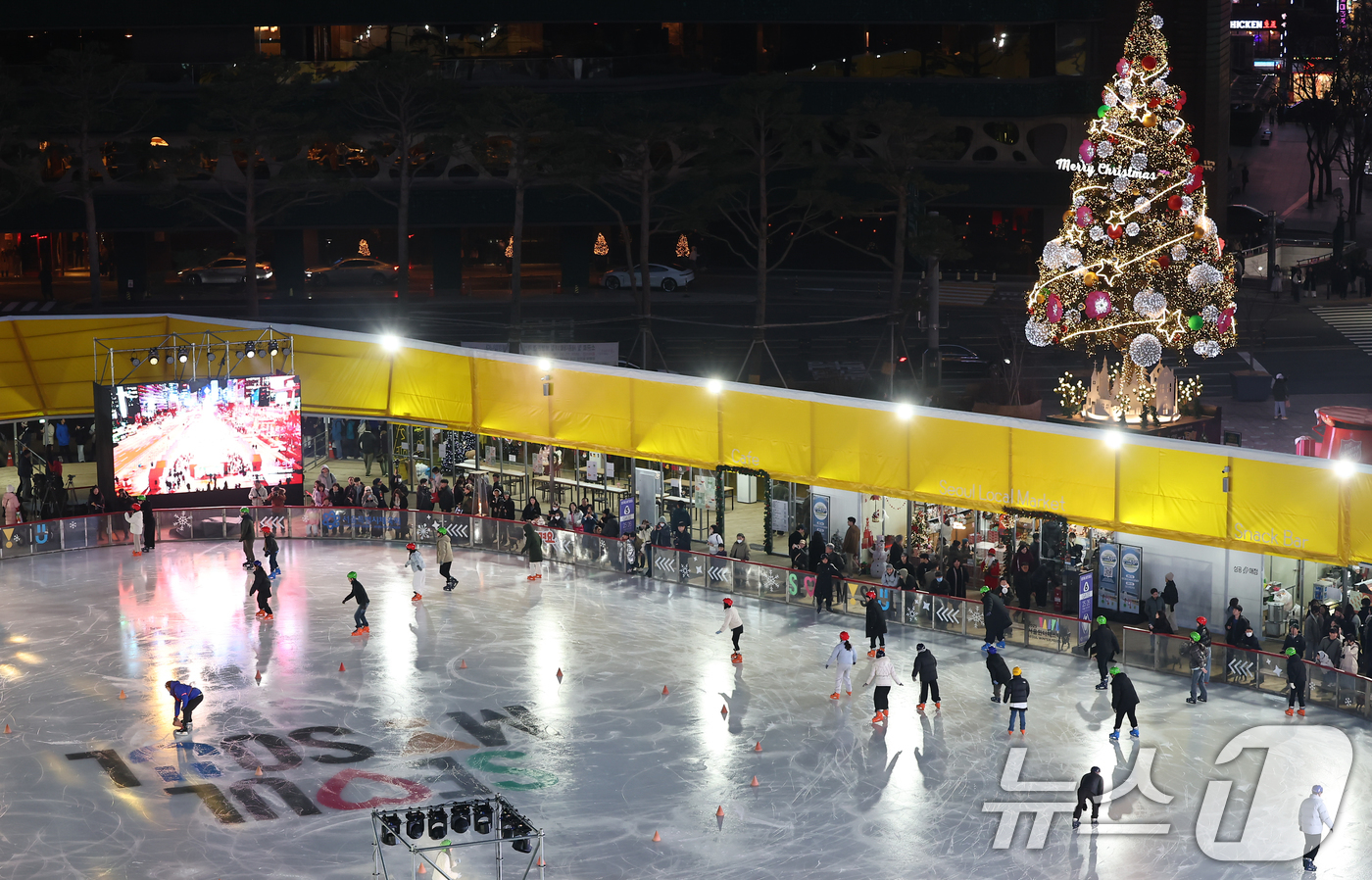 (서울=뉴스1) 김도우 기자 = 19일 오후 서울광장 스케이트장에서 시민들이 스케이트를 타며 즐거운 시간을 보내고 있다. 이날 개장한 서울광장 스케이트장은 내년 2월 8일까지 52일 동안 운영한다. 2025.12.19/뉴스1