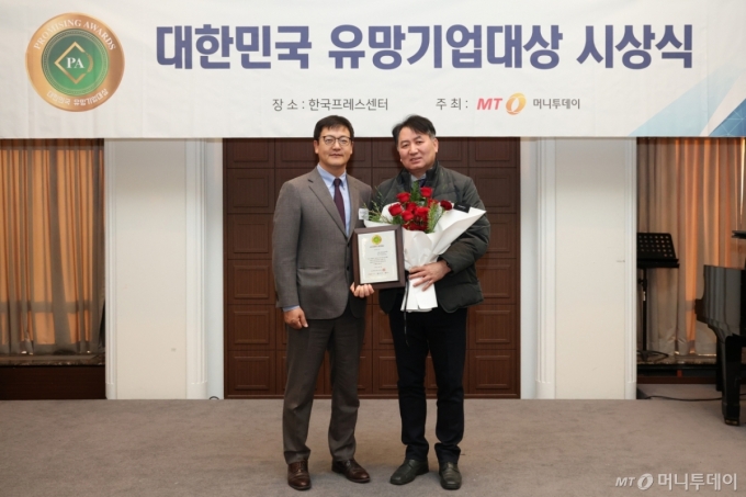 꿈에 심리상담센터 한철조 센터장(오른쪽)이 '2025 대한민국 유망기업대상' 수상 후 머니투데이 송기용 전무(왼쪽)와 기념 촬영을 하고 있다./사진=이기범 기자 |