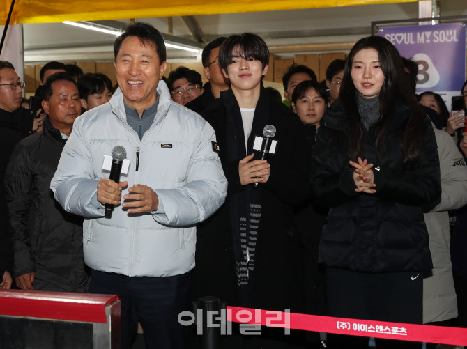[이데일리 김태형 기자] 오세훈 서울시장과 차준환, 심석희 선수가 19일 오후 서울광장에서 스케이트장 개장 선언을 하고 있다.