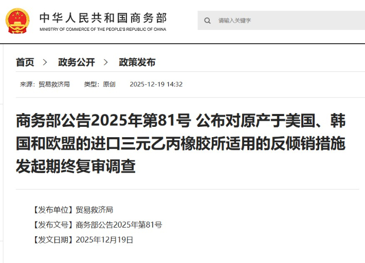중국 상무부가 한국과 미국, 유럽연합(EU)산 '기능성 합성 고무'(EPDM)에 대한 반덤핑 관세 종료를 앞두고, 해당 조치를 유지할지 여부를 심사하겠다고 밝혔다.
