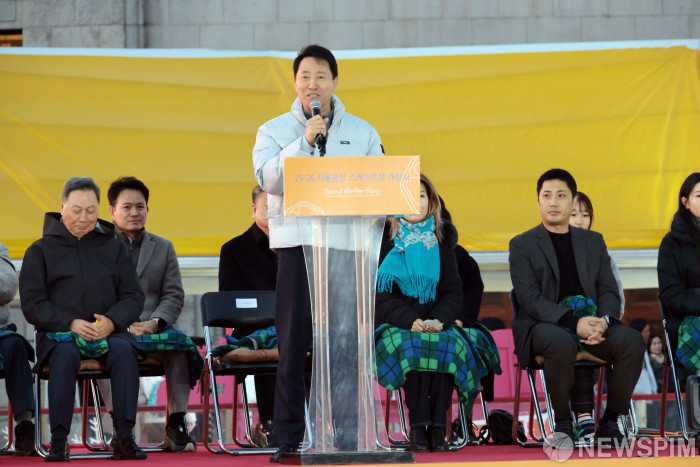 [서울=뉴스핌] 이길동 기자 = 오세훈 서울시장이 19일 오후 서울 중구 서울광장에서 열린 2025년 서울광장 스케이트장 개장식에서 인사말을 하고 있다. 서울광장 스케이트장은 19일 개장해 내년 2월8일까지 52일 동안 운영된다. 올해로 19번째 겨울을 맞는 서울광장 스케이트장은 올해 '윈터 링(Winter Ring)'이라는 새로운 콘셉트로 시민과 관광객을 맞이한다. 입장료는 2004년 첫 개장부터 변함없는 1000원이다.운영시간은 일요일부터 금요일의 경우 오전 10시부터 오후 9시30분까지, 토요일과 공휴일의 경우 오전 10시부터 오후 11시까지다.2025.12.2025.12.19.wspim.com