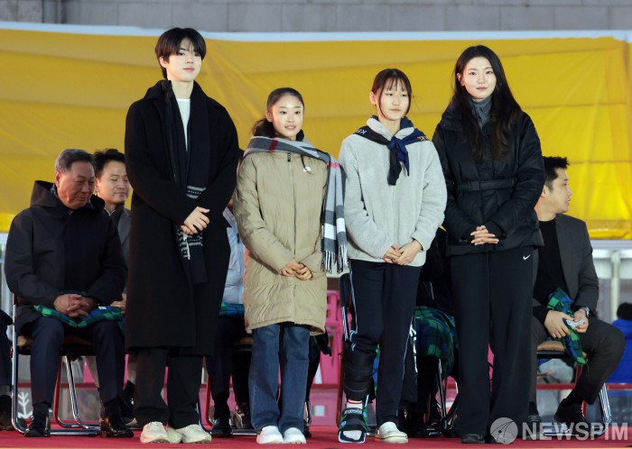 [서울=뉴스핌] 이길동 기자 = 19일 오후 서울 중구 서울광장에서 열린 2025년-2026년 서울광장 스케이트장 개장식에서 차준환, 심석희 선수가 빙상 유망주에게 소장품 전달 후 기념촬영을 하고 있다.서울광장 스케이트장은 19일 개장해 내년 2월8일까지 52일 동안 운영된다. 올해로 19번째 겨울을 맞는 서울광장 스케이트장은 올해 '윈터 링(Winter Ring)'이라는 새로운 콘셉트로 시민과 관광객을 맞이한다. 입장료는 2004년 첫 개장부터 변함없는 1000원이다.운영시간은 일요일부터 금요일의 경우 오전 10시부터 오후 9시30분까지, 토요일과 공휴일의 경우 오전 10시부터 오후 11시까지다. 2025.12.19 gdlee@newspim.com