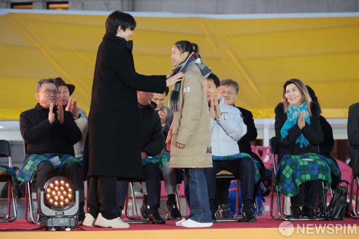 [서울=뉴스핌] 이길동 기자 = 19일 오후 서울 중구 서울광장에서 열린 2025년-2026년 서울광장 스케이트장 개장식에서 차준환 선수가 빙상 유망주에게 소장품을 전달하고 있다.서울광장 스케이트장은 19일 개장해 내년 2월8일까지 52일 동안 운영된다. 올해로 19번째 겨울을 맞는 서울광장 스케이트장은 올해 '윈터 링(Winter Ring)'이라는 새로운 콘셉트로 시민과 관광객을 맞이한다. 입장료는 2004년 첫 개장부터 변함없는 1000원이다.운영시간은 일요일부터 금요일의 경우 오전 10시부터 오후 9시30분까지, 토요일과 공휴일의 경우 오전 10시부터 오후 11시까지다. 2025.12.19 gdlee@newspim.com |
