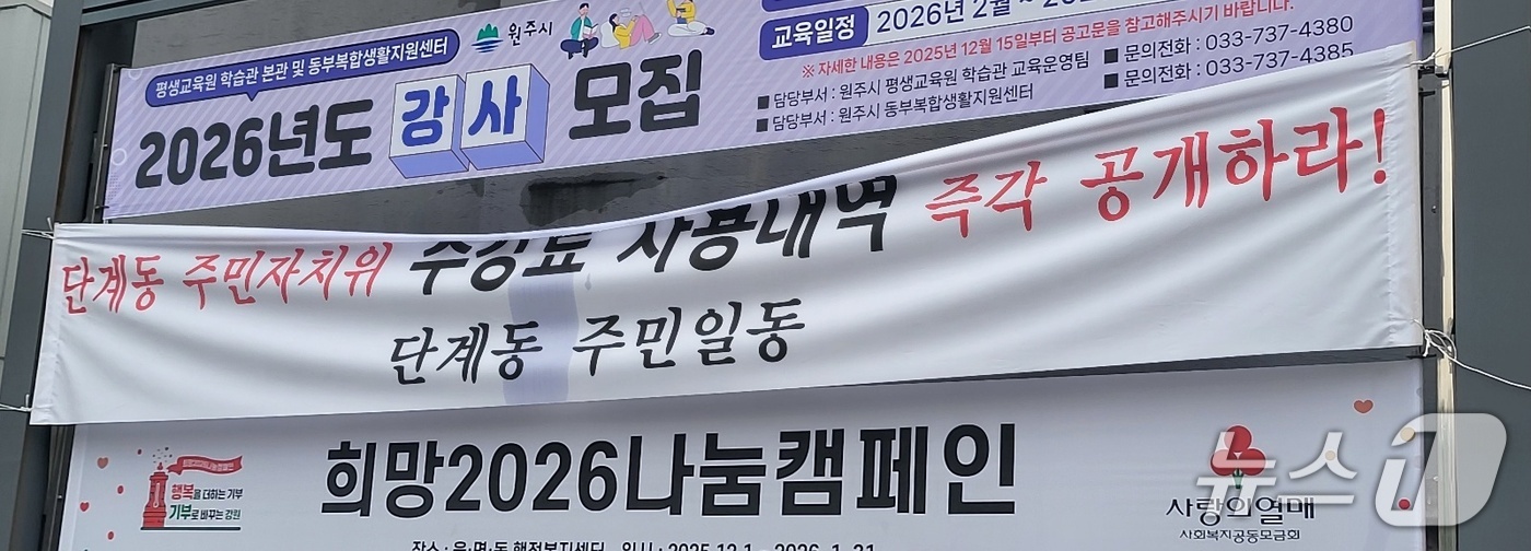강원 원주시가 최근 단계동주민자치위원회의 주요 프로그램 수강료를 비롯해 위원회의 운영 문제를 지적하면서 위원회 측과 갈등을 빚는 가운데, 최근 단계동 주변에 이와 관련된 현수막이 게시돼 있다. 2025.12.19/뉴스1 |