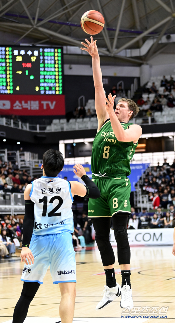 19일 수원KT소닉붐아레나에서 열린 프로농구 수원 KT와 원주 DB의 경기. DB 앨런슨이 KT 문정현의 수비를 피해 골밑슛을 시도하고 있다. 수원=허상욱 기자wook@sportschosun.com/2025.12.19/
