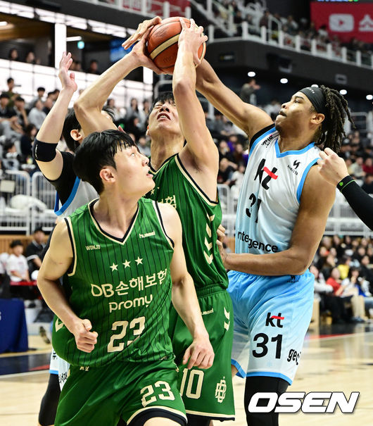 [OSEN=수원, 지형준 기자] 19일 오후 수원 KT 소닉붐 아레나에서 2025-2026 LG전자 프로농구 수원 KT와 원주 DB의 경기가 열렸다.