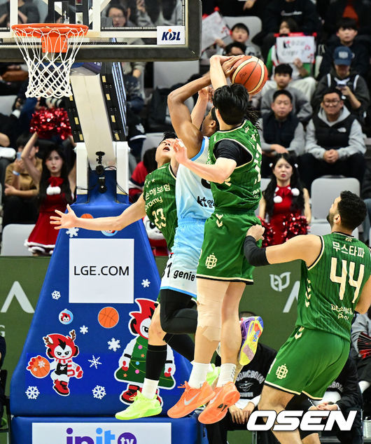KT는 11승 11패(6위), DB는 12승 9패(4위)를 기록중이다.1쿼터 DB 정효근이 KT 힉스를 슛블록하고 있다. 2025.12.19 /jpnews@osen.co.kr