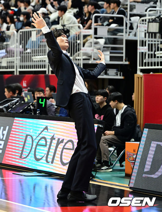 KT는 11승 11패(6위), DB는 12승 9패(4위)를 기록중이다.2쿼터 DB 김주성 감독이 판정에 아쉬워하고 있다. 2025.12.19 /jpnews@osen.co.kr