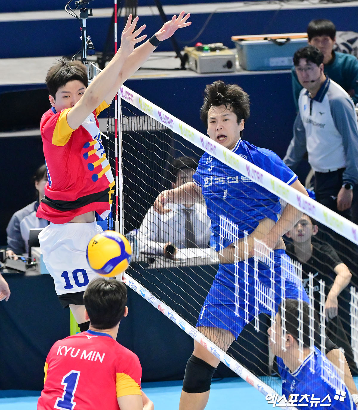 (엑스포츠뉴스 인천, 김한준 기자) 19일 오후 인천 계양체육관에서 열린 '진에어 2025-2026 V-리그' 대한항공과 한국전력의 경기, 한국전력 서재덕이 공격을 시도하고 있다.