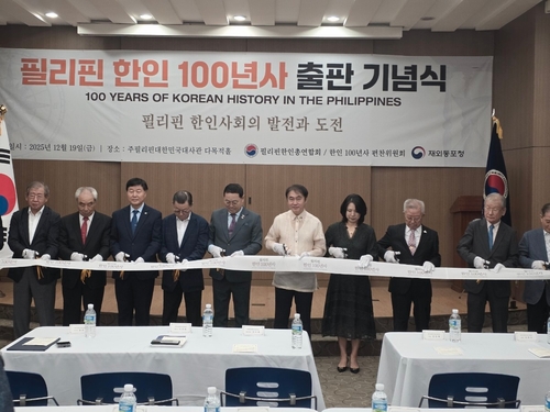 ▲ 필리핀 한인사회의 형성·발전 과정을 담은 책 '필리핀 한인 100년사' 출판기념식이 19일(현지시간) 필리핀 마닐라 주필리핀 한국대사관에서 열렸다. 이 책은 지난 100여년 간 필리핀에 정착해 현지 사회 일원으로 자리 잡아 온 한인 동포들의 삶과 공동체의 역사를 정리해 공식 기록으로 남기기 위해 집필됐다. 이날 행사에는 대사관과 필리핀 한인총연합회, 각 지역 한인회 관계자 등이 참석, 출판을 축하했다. (하노이=연합뉴스)