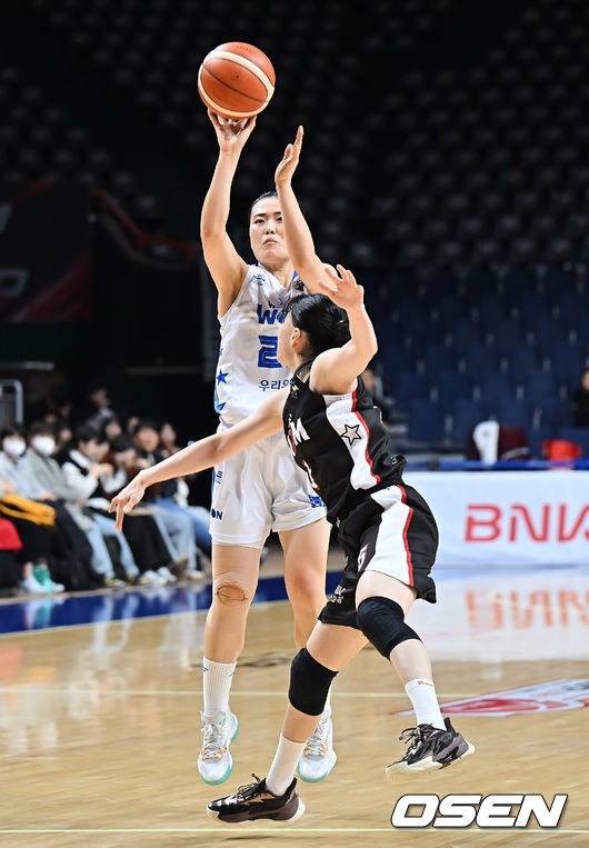 아산 우리은행 이명관이 부산 BNK 이소희의 마크를 피해 3점슛을 시도하고 있다. 2025.12.19 / foto0307@osen.co.kr