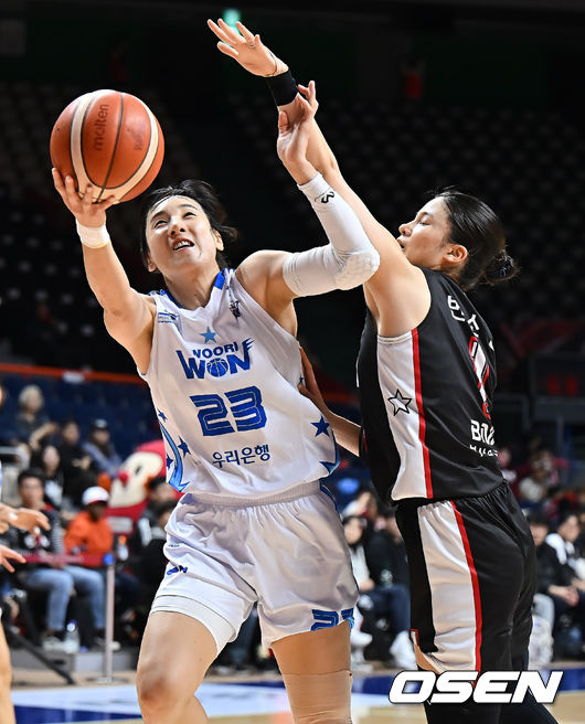 아산 우리은행 김단비가 부산 BNK 변소정의 마크를 피해 골밑슛을 시도하고 있다. 2025.12.19 / foto0307@osen.co.kr