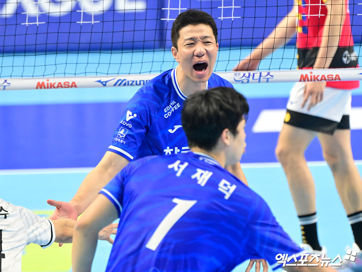 (엑스포츠뉴스 인천, 김한준 기자) 19일 오후 인천 계양체육관에서 열린 '진에어 2025-2026 V-리그' 대한항공과 한국전력의 경기, 한국전력 신영석이 득점 후 기뻐하고 있다.