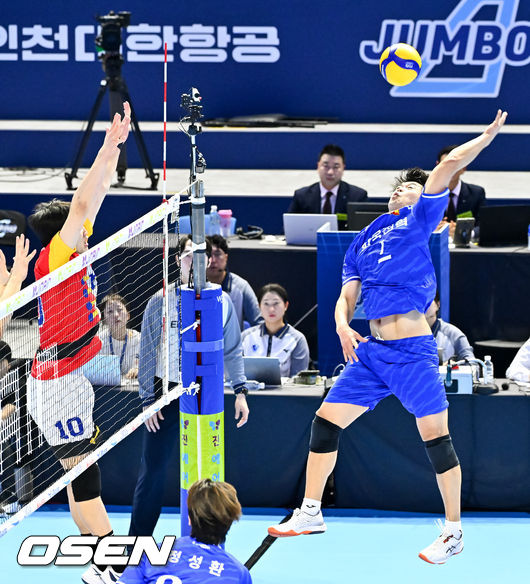 [OSEN=계양(인천), 박준형 기자] 19일 오후 인천 계양체육관에서 진에어 2025-2026 V리그 남자부 대한항공과 한국전력의 경기가 진행됐다.