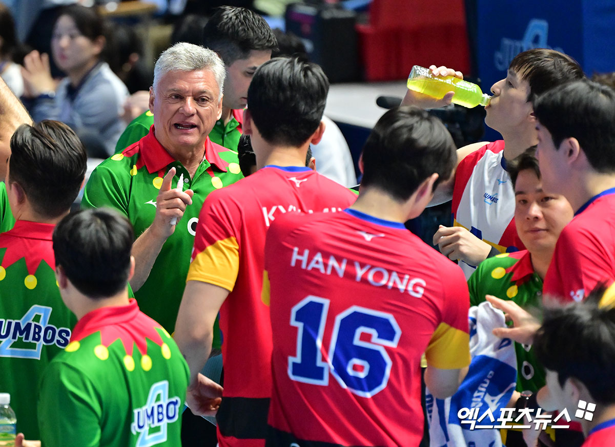 (엑스포츠뉴스 인천, 김한준 기자) 19일 오후 인천 계양체육관에서 열린 '진에어 2025-2026 V-리그' 대한항공과 한국전력의 경기, 대한항공 헤난 감독이 작전타임을 갖고 있다.