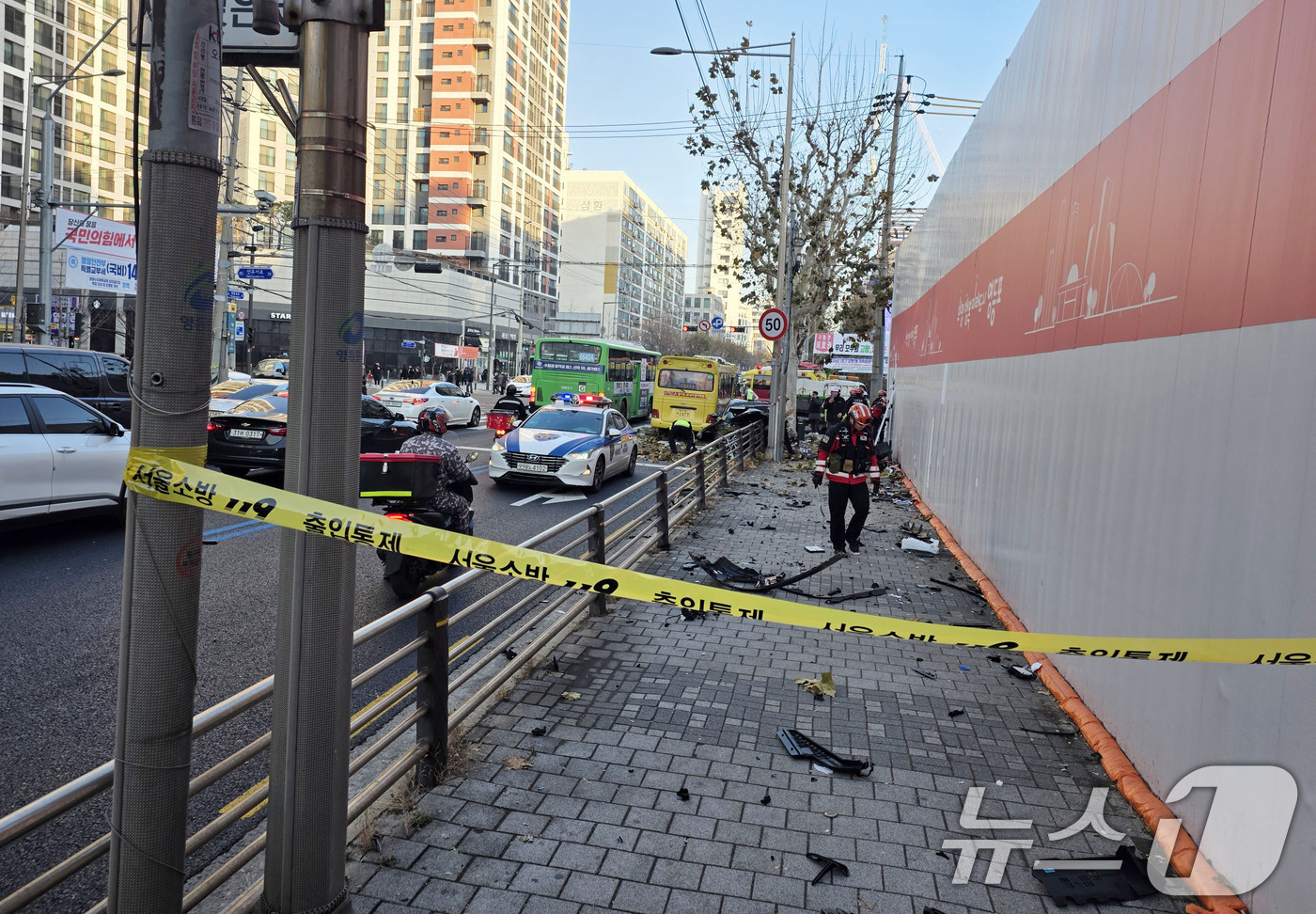 (서울=뉴스1) = 19일 오후 3시 25분쯤 서울 양평역 근처의 도로에서 승용차 1대가 학원버스와 가로수를 들이받는 사고 가 발생해 승용차 운전자가 숨지고 학원버스에 타고 있던 2명이 다쳤다. 버스 안에 학생들은 타고 있지 않았던 것으로 전해졌다. 사진은 사고 현장 모습. (서울소방재난본부 제공. 재판매 및 DB금지) 2025.12.19/뉴스1