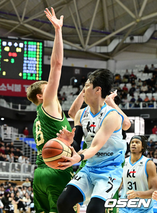 KT는 11승 11패(6위), DB는 12승 9패(4위)를 기록중이다.3쿼터 KT 정창영이 DB 엘런슨의 수비를 피해 패스를 시도하고 있다. 2025.12.19 /jpnews@osen.co.kr