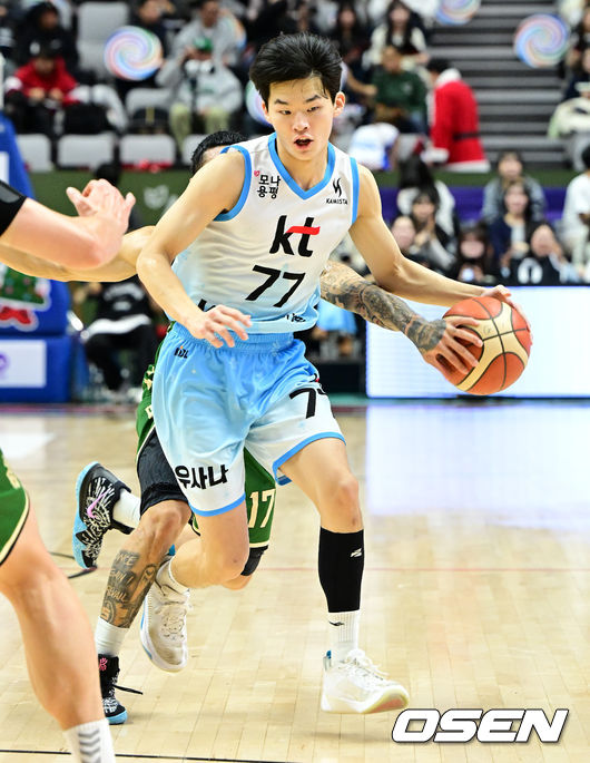 [OSEN=수원, 지형준 기자] 19일 오후 수원 KT 소닉붐 아레나에서 2025-2026 LG전자 프로농구 수원 KT와 원주 DB의 경기가 열렸다.