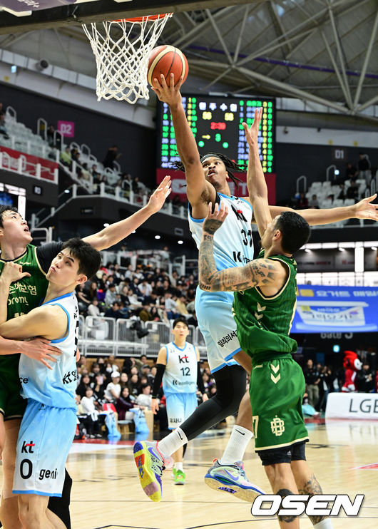 [OSEN=수원, 지형준 기자] 19일 오후 수원 KT 소닉붐 아레나에서 2025-2026 LG전자 프로농구 수원 KT와 원주 DB의 경기가 열렸다.