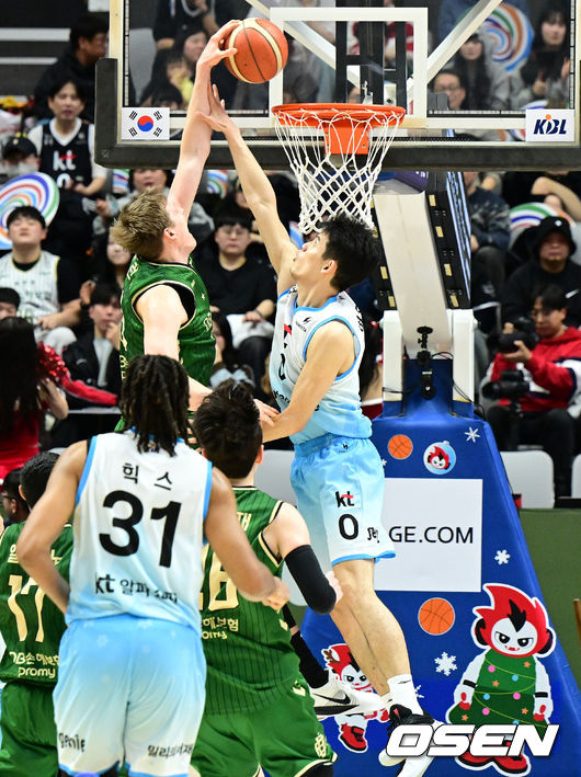 KT는 11승 11패(6위), DB는 12승 9패(4위)를 기록중이다.3쿼터 DB 엘런슨이 KT 하윤기의 수비를 피해 덩크를 성공시키고 있다. 2025.12.19 /jpnews@osen.co.kr
