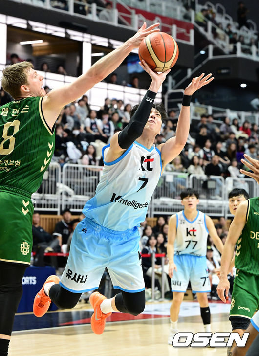 KT는 11승 11패(6위), DB는 12승 9패(4위)를 기록중이다.3쿼터 KT 정창영이 DB 엘런슨의 수비를 피해 슛을 시도하고 있다. 2025.12.19 /jpnews@osen.co.kr