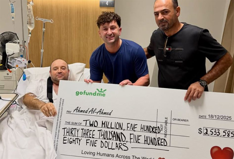 19일(현지시간) 로이터 통신에 따르면 시드니 한 병원에서 아흐메드 알 아흐메드 씨는 인플루언서이자 국제 온라인 기부금 모금 사이트 ‘고펀드미’ 공동 기획자인 재커리 데레니오우스키로부터 수표를 전달받았다.