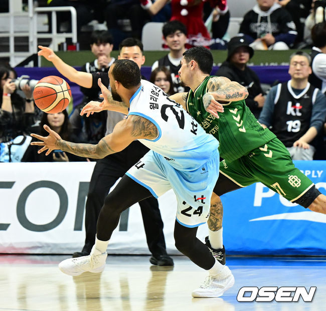이날 DB가 KT에 83-81로 짜릿한 역전 승리를 거뒀다. 헨리 엘런슨이 38점 12리바운드로 맹활약을 펼쳤다.4쿼터 DB 알바노가 KT 윌리엄스에게 전해지는 볼을 차단하고 있다. 2025.12.19 /jpnews@osen.co.kr