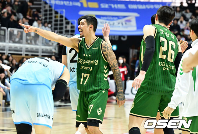 이날 DB가 KT에 83-81로 짜릿한 역전 승리를 거뒀다. 헨리 엘런슨이 38점 12리바운드로 맹활약을 펼쳤다.경기를 마치고 DB 알바노가 승리를 기뻐하고 있다. 2025.12.19 /jpnews@osen.co.kr