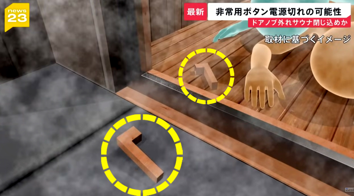 일본 도쿄의 한 프라이빗 사우나에서 발생한 화재로 이용객 부부가 숨진 가운데, 사고 현장에서는 출입문에 설치된 ‘L자형 도어핸들’이 떨어져 있는 모습이 파악됐다. 현장을 재현한 그래픽 화면. 사진 TBS 캡처 |