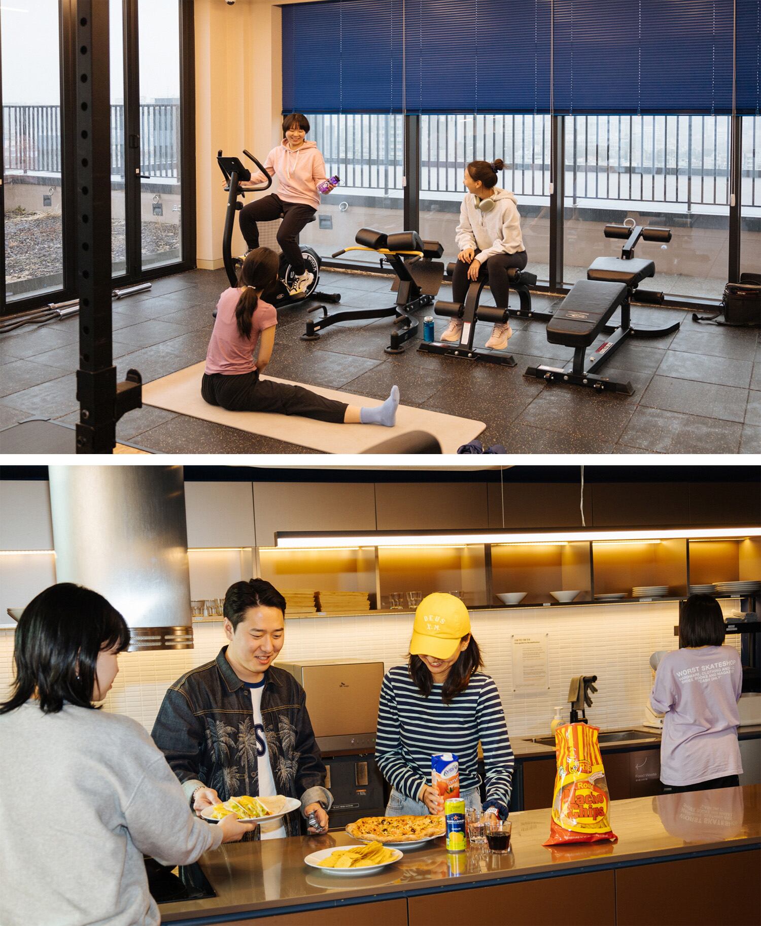 코리빙 업체 ‘맹그로브’의 공용 피트니스룸에서 운동하는 청년들(사진 위). 아래 사진은 공유 주방에서 요리를 하는 모습이다. /맹그로브 |