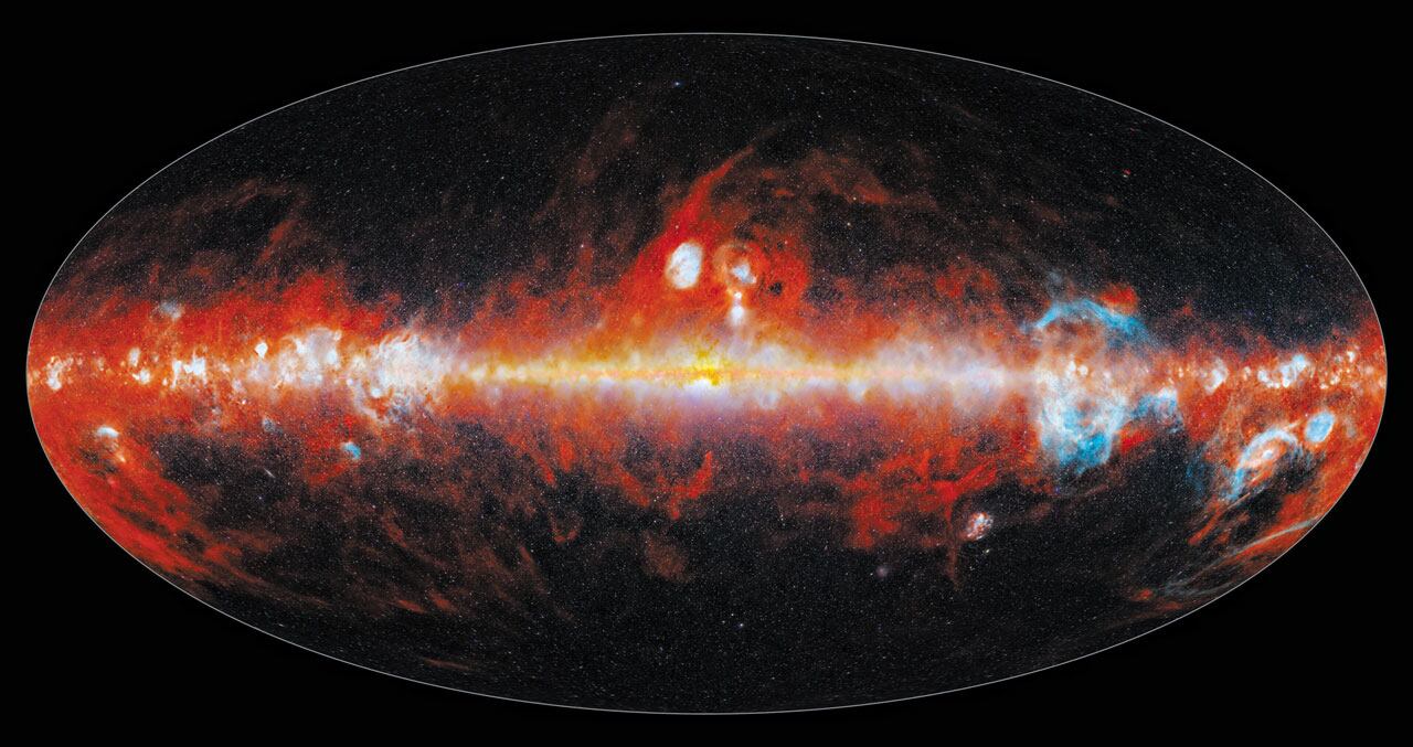 우주항공청은 우주망원경 스피어엑스(SPHEREx)가 처음으로 완성한 전체 하늘 지도 영상을 19일 공개했다. 스피어엑스는 한국천문연구원과 미국 항공우주국(NASA)이 공동으로 개발한 우주망원경이다. 2025년 3월 발사돼 5월부터 본격적으로 우주를 관측했다. 남극과 북극을 오가는 궤도로 하루에 지구를 약 14.5바퀴 돌며 3600장의 사진을 찍었다. 연구팀은 6개월 촬영한 이미지를 합성해 첫 하늘 지도를 완성했다. 우주 전체를 사람의 눈으로는 볼 수 없는 102가지 적외선 빛깔로 나눠 촬영한, 인류 최초의 우주 지도다. 우주먼지는 빨간색, 수소 가스는 파란색으로 나타나고 이 가운데 별들이 박혀있다. 이 관측 자료는 우주가 어떻게 시작됐는지, 은하와 별이 어떻게 만들어지고 진화했는지, 생명의 재료가 되는 물과 얼음이 우주에 어떻게 분포돼 있는지 같은 의문을 해결하는 데 활용된다.