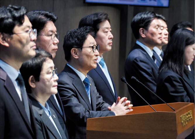 뉴스1與 대전·충남 의원들 “통합 환영” 대전·충남에 지역구를 둔 더불어민주당 국회의원들이 19일 국회에서 대전·충남 통합과 관련한 기자회견을 하고 있다. |