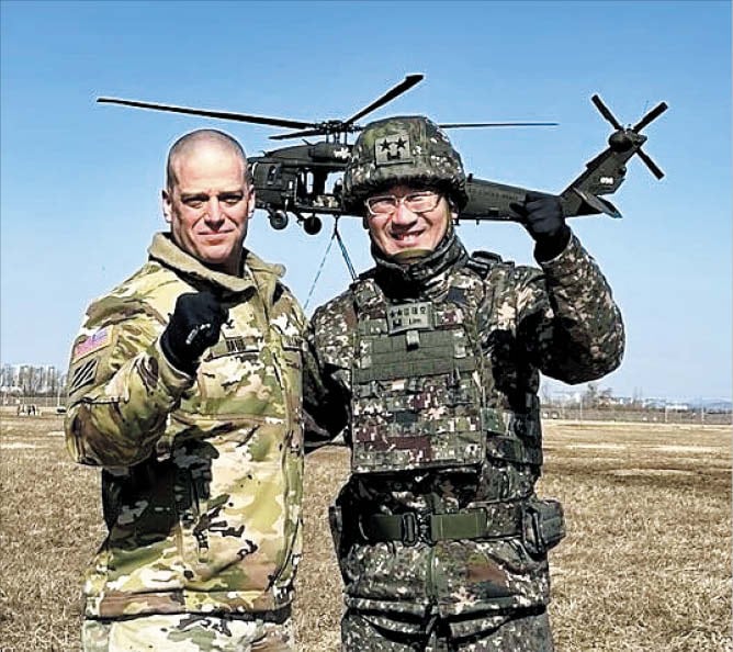 라웁 대령 제공미 2사단 2전투항공여단장 제이슨 S 라웁 대령이 연합훈련을 마치고 임태호 육군 제2신속대응사단장과 찍은 기념사진. |