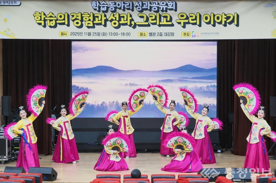 대전평생교육진흥원이 주관한 학습동아리 성과공유회에서 참가자들이 전통 부채춤 공연을 선보이며 배움의 과정과 성과를 무대 위에서 표현하고 있다 |