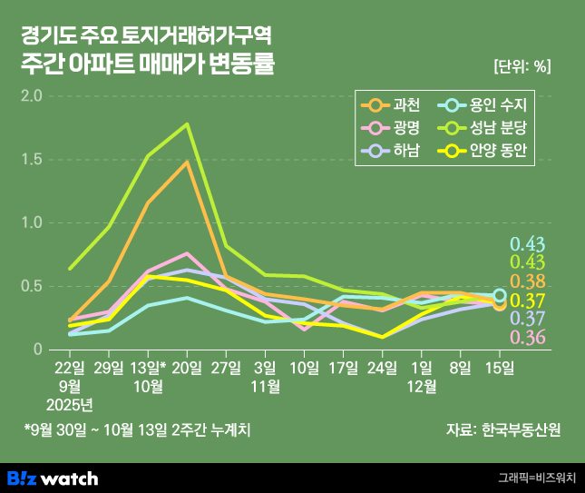 이 밖에 토허구역인 △과천(0.45%→0.38%) △안양 동안(0.42%→0.37%) △성남 중원(0.15%→0.10%) △의왕(0.25%→0.24%) △용인 수지(0.44%→0.43%) △수원 팔달(0.19→0.13%) △수원 영통(0.21%→0.15%) △광명(0.38%→0.36%) 등은 상승폭이 작아졌지만 경기도 내에서 비교적 높은 상승률을 보였어요.